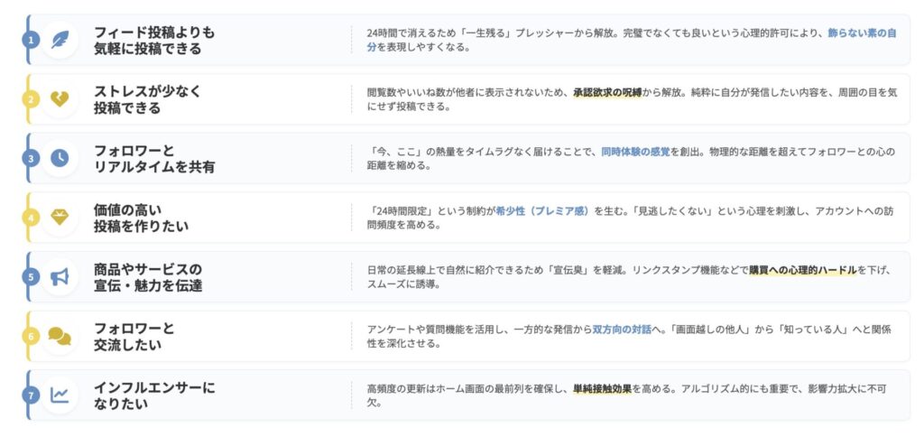 まさに、「今この瞬間」だけを切り取ることに特化した24時間限定のコンテンツだと言えます。