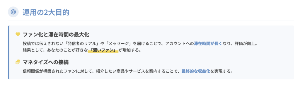 ストーリーズ運用するそもそもの目的としては、「自分のアカウントの滞在時間を増やしてファンになってもらうこと」、そして「最終的にマネタイズにつなげていくこと」の2点になるかなと考えています。