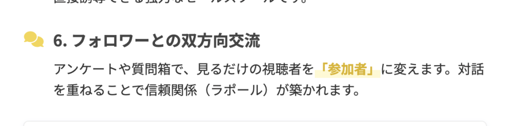 投稿だけでは伝えきれない発信者のリアルや伝えたいメッセージを発信することによって、滞在時間が長くなり評価も上がるしあなたのことが好きになるファンも増えてくれるという流れになるわけです。