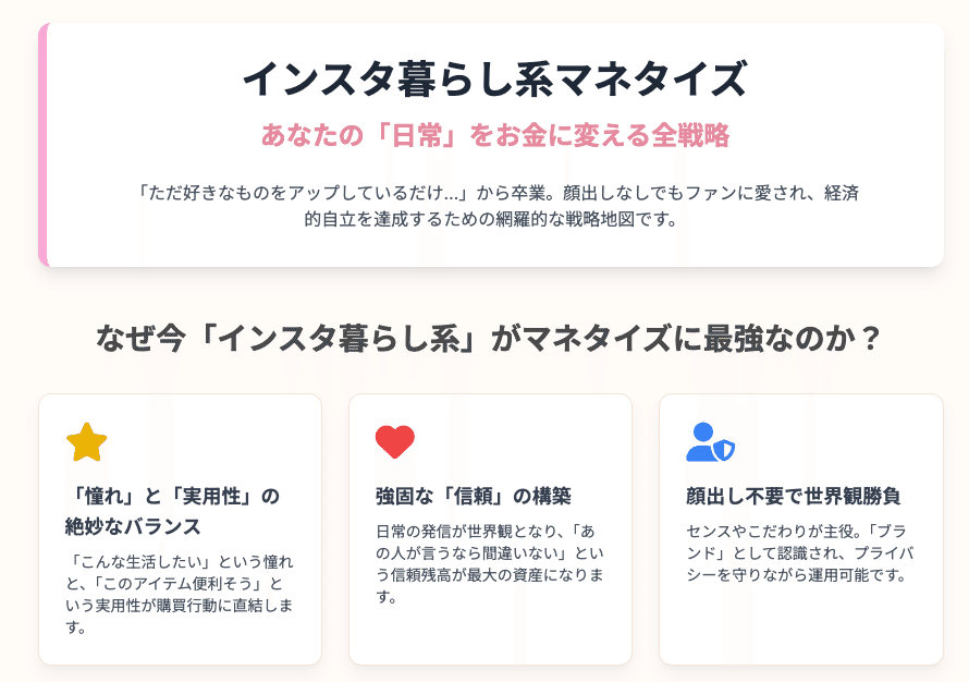 インスタグラムの「暮らし系」アカウントは、数あるジャンルの中でも最もマネタイズに適したジャンルの一つであり、正しい戦略と導線設計さえ理解すれば、あなたの日常は確実に収益の柱となり得ます。
