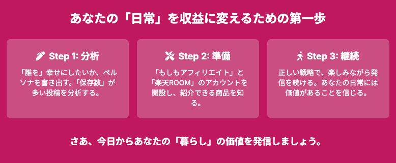 私がこれまで数多くのアカウントの浮沈を見てきた中で確立した、「暮らし系」発信者がゼロから収益を確立し、顔出しなしでもファンに愛されながら経済的自立を達成するための、網羅的な戦略地図です。
