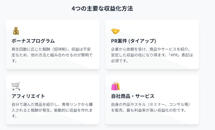 ここでは、リールを使った収益化の代表的な4つの方法について、その仕組みと特性を詳しく見ていきましょう。