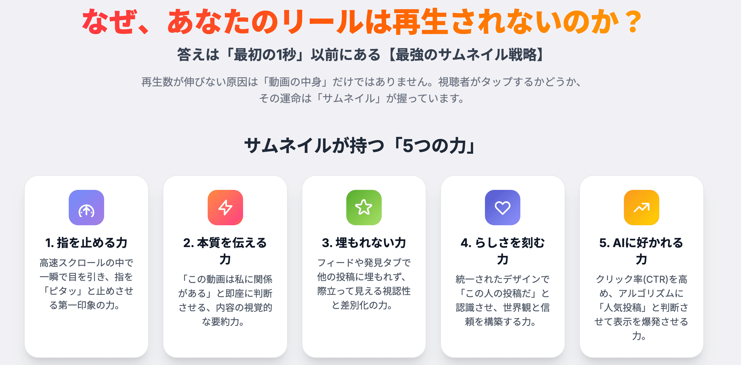 リールのサムネイルは、単なる表紙以上の、極めて戦略的な役割を担っているのです。