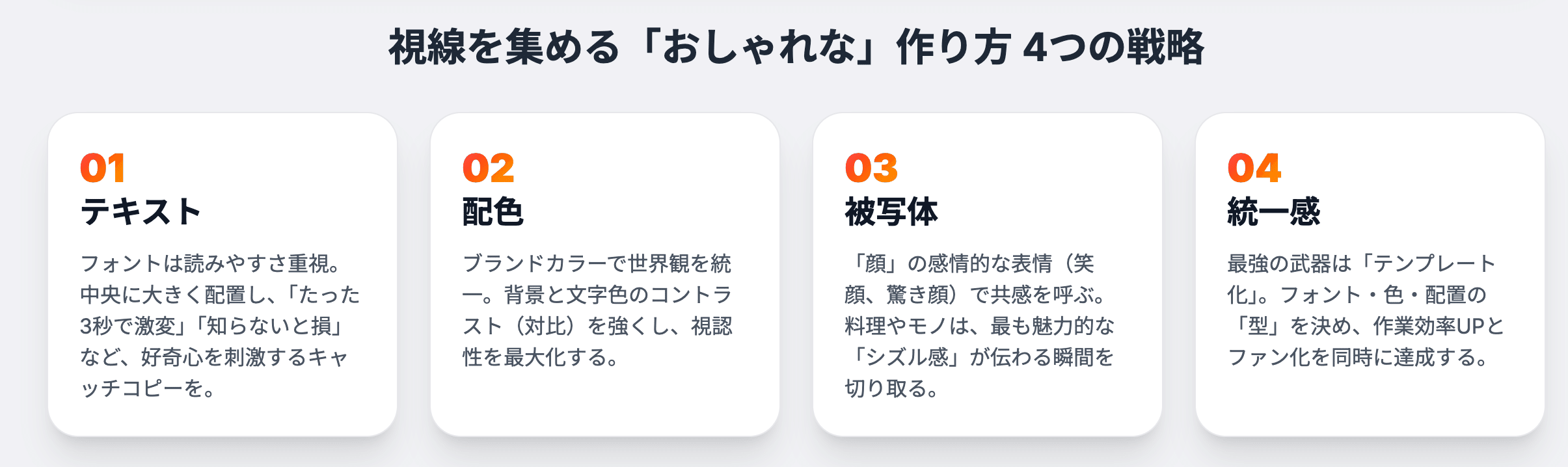 「この動画を見れば、**こんな未来(美味しい料理、役立つ知識、美しい景色)**が手に入る」という期待値を、サムネイル1枚で的確に伝える伝達力が求められます。
