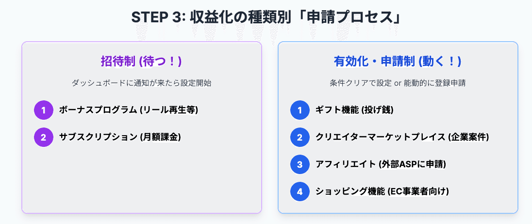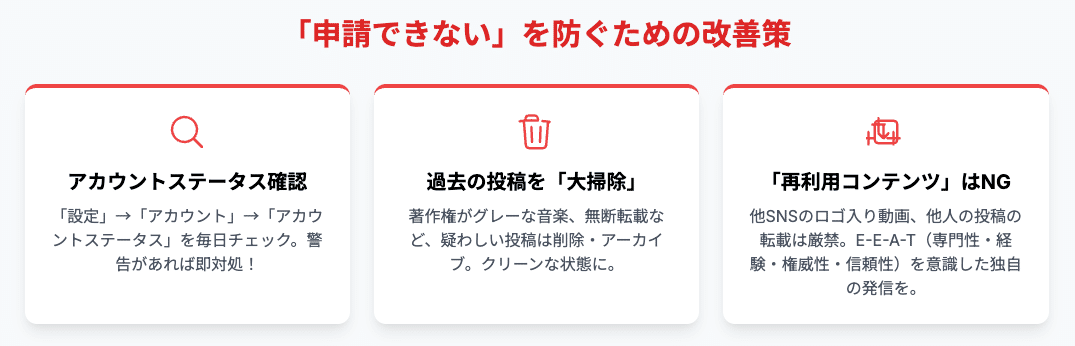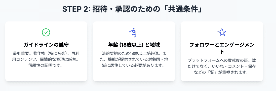 したがって、私たちがまず目指すべきは、「申請ボタンを探すこと」ではなく、「プラットフォーム側から収益化パートナーとして招待されるに値するアカウントを作り上げること」なのです。
