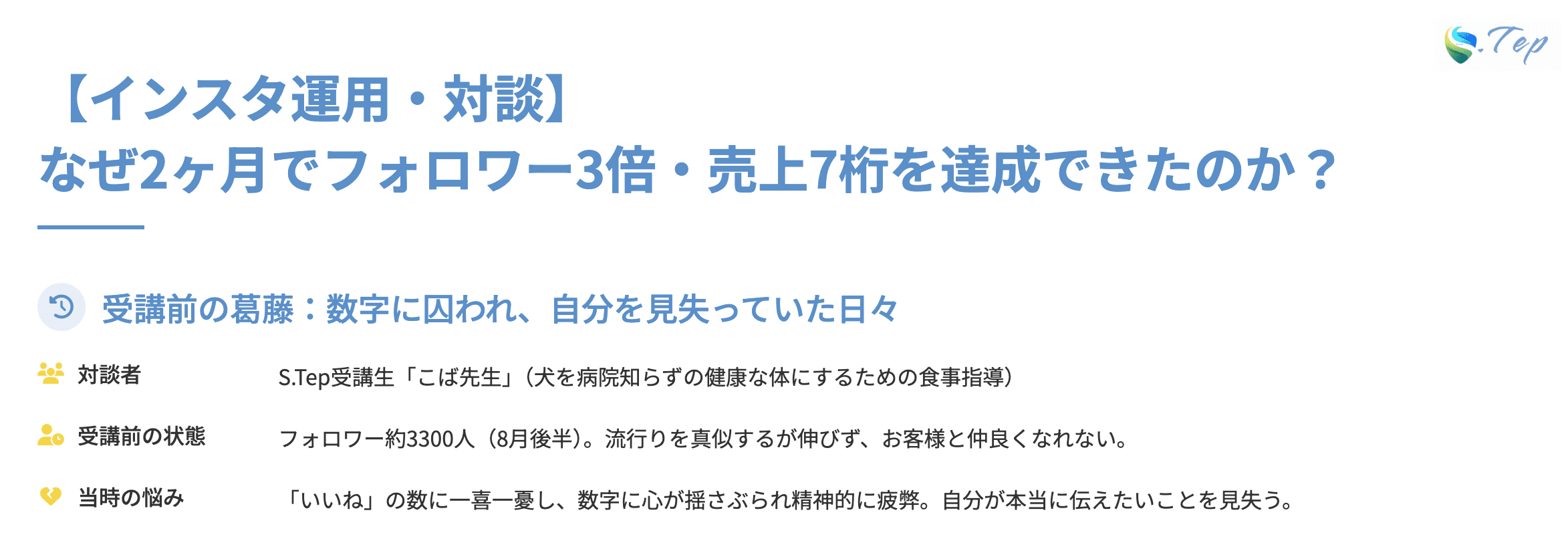 そんなインスタ講座「S.Tep」を受講して成果を出された方との対談も記事にしているので合わせてご覧ください!
