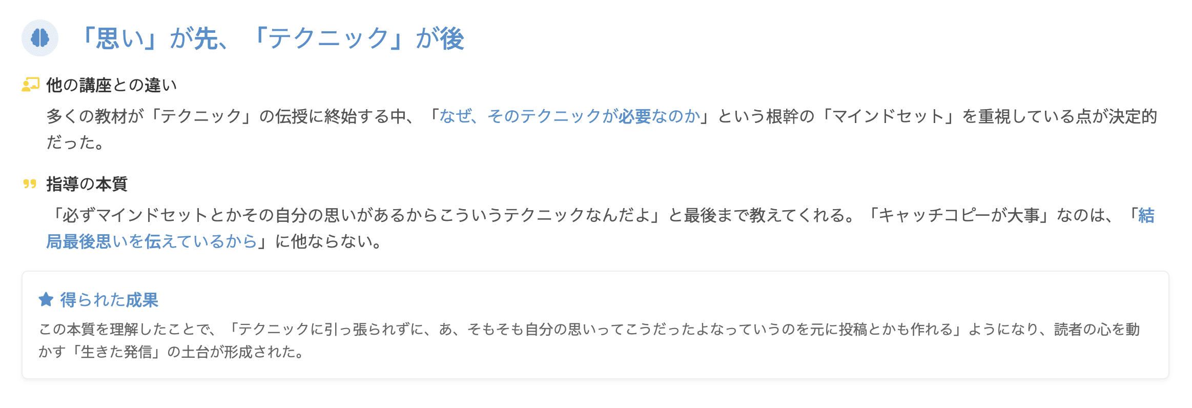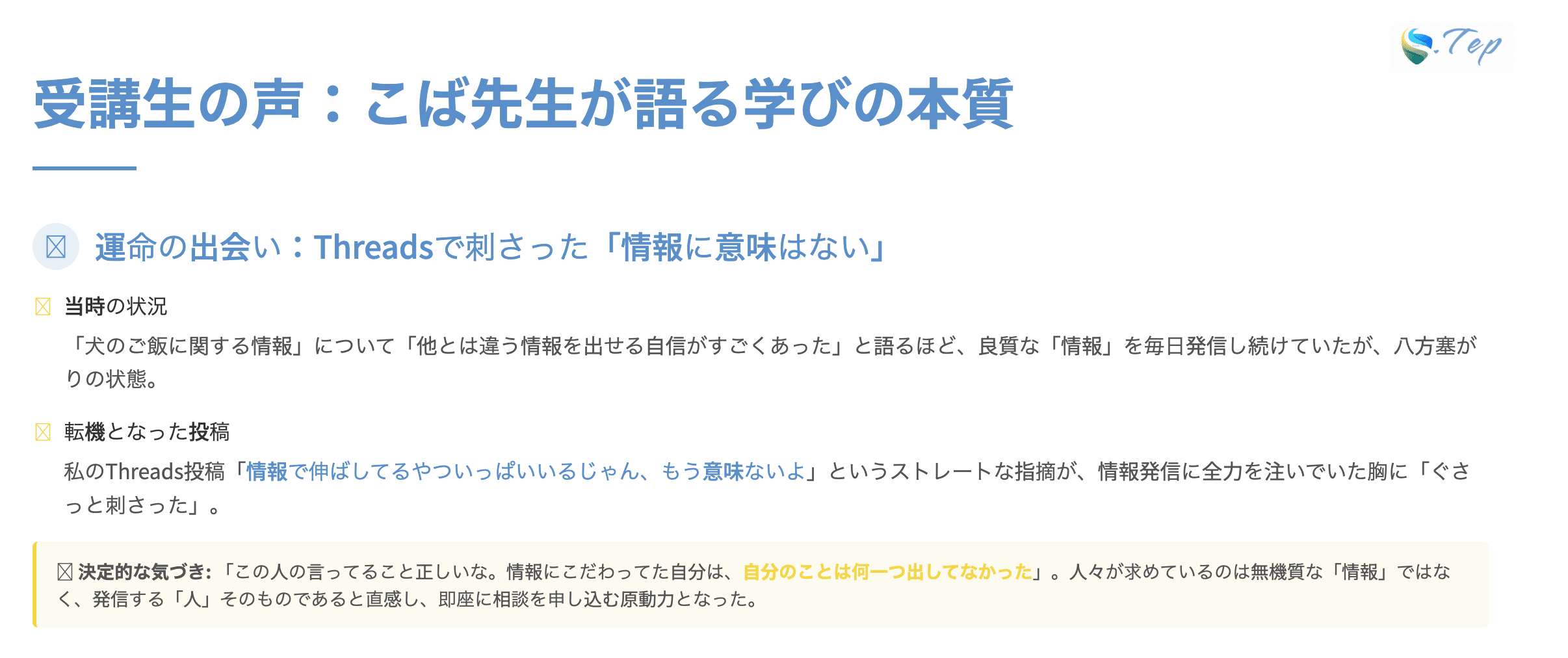 こば先生も、「必ずマインドセットとかその自分の思いがあるからこういうテクニックなんだよ、とかいうところをちゃんと最後まで教えてくれる」点が、他のセミナーとは決定的に違ったと強調されていました。