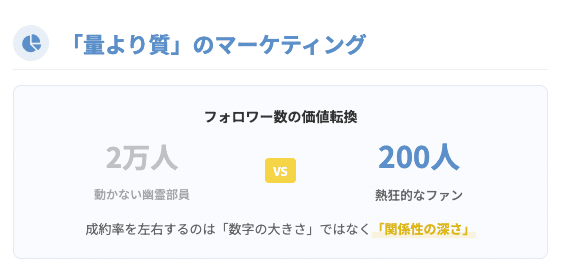 「2万人のフォロワーがいても誰も動かせないより、200人のフォロワーで5人を確実に動かせる方が価値がある」という考え方です。
