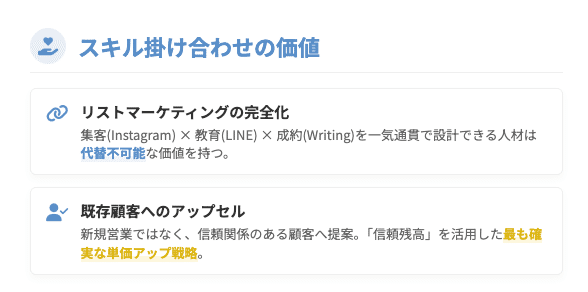 ゆきさんは「LINE構築」という強力な武器を持っていましたが、そこに「インスタ運用」という認知獲得の武器を加えることで、マーケティング全体を俯瞰できるようになりました。