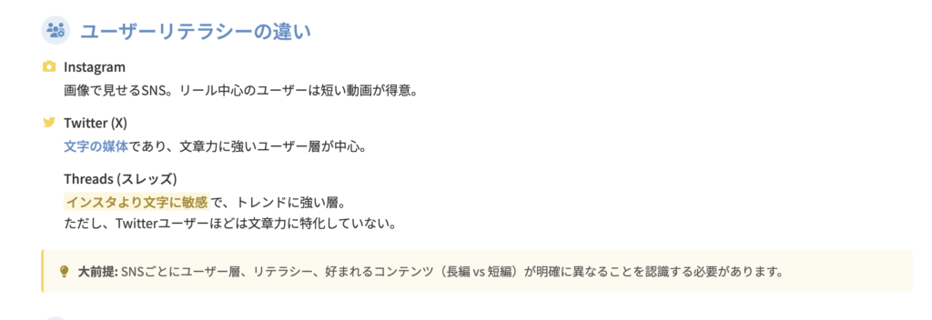 このように大前提としてSNSごとに見ているユーザーのリテラシー層やプラットフォームによる文章の読める理解度とか何が好きなのかは結構違っている。