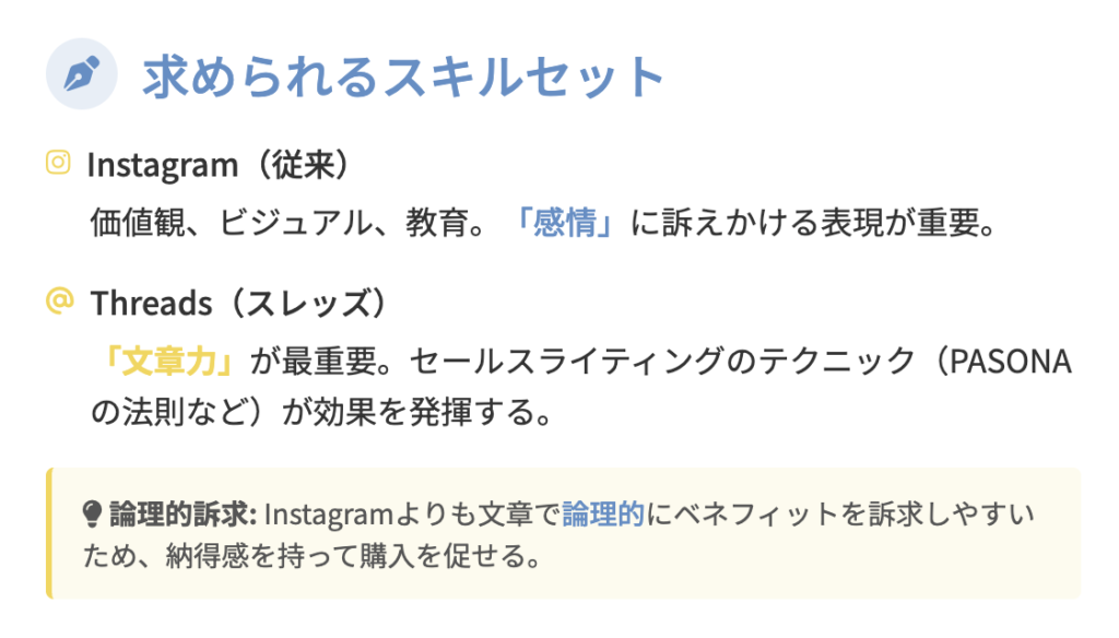 一方、TikTokとかインスタのリールを中心に見る人たちは短い動画の方が得意、Threads(スレッズ)はTwitterほど文章は得意ではないけどインスタよりも文章が得意な人が現在見ているSNSという立ち位置で考えると非常に考えやすいのではないでしょうか?