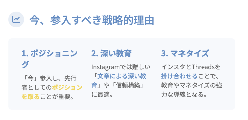 インスタという媒体は画像で見せるSNSでしたが、Threads(スレッズ)はこのインスタよりも文字に敏感な人たち、つまりトレンドものに乗っ たりとか文字に強い人たちが来ていることを忘れてはいけません。