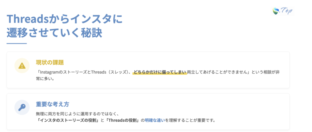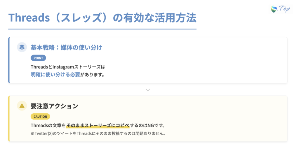 これはどういうことかというと、Threads(スレッズ)の文章とインスタのストーリーズに載せる文章これをコピペでやっている人は要注意です。